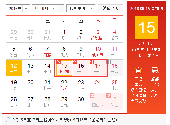 2016年北京華康普美科技有限公司“中秋節(jié)”假期為:9月15日(星期四)、9月16日(星期五)、9月17日(星期六)共放假3天,9月18日(星期日)正常上班。中秋節(jié)假期安排見下圖: