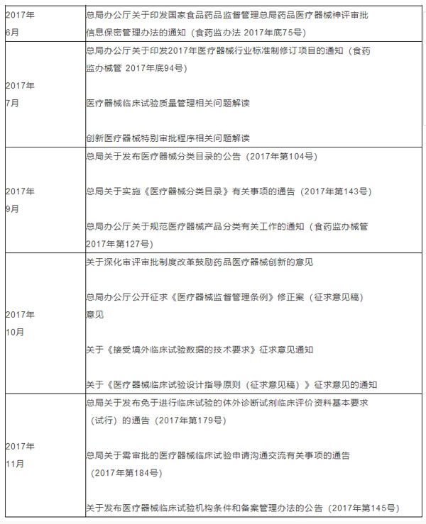 截止到2017年11月底,共發(fā)布醫(yī)療器械相關(guān)的公告超過20個,尤其是10月8日頒布《關(guān)于深化審評審批制度改革鼓勵藥品醫(yī)療器械創(chuàng)新的意見》后,為貫徹落實(shí)新規(guī),繼續(xù)發(fā)布了6份相關(guān)的征求意見稿和3個決定,涉及境外臨床試驗(yàn)數(shù)據(jù)、審評審批效率、鼓勵創(chuàng)新等多個方面。