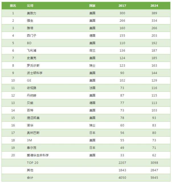 在全球銷售前20名醫(yī)療器械公司中,位居榜首的美敦力在2017年的銷售額為300億美元,到2024年年銷售額預(yù)計將達到389億美元,仍將位居第一;雅培因為2017年1月初完成收購圣猶達,2017年銷售收入大幅增長60.9%,成為全球第三大醫(yī)療設(shè)備制造商;BD在2017年收入負(fù)增長3.6%,是前20強中唯一一家收入下滑的公司,主要因為在2016年10月完成了剝離呼吸解決方案業(yè)務(wù)。