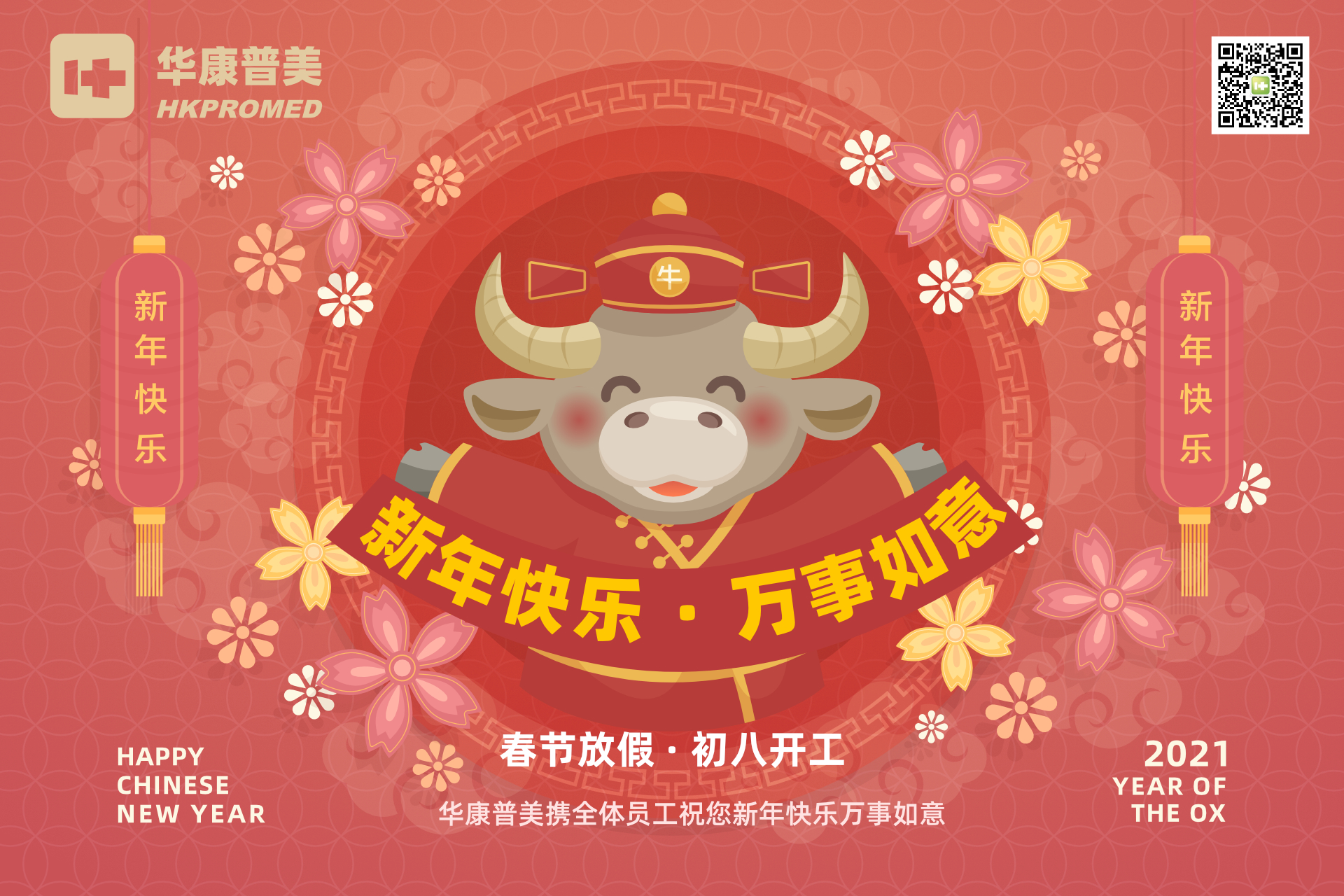 2021年春節(jié)在即,感謝各位醫(yī)院用戶,及醫(yī)療器械經(jīng)銷商長期以來對(duì)北京華康普美的支持與厚愛!向您致以最誠摯的祝福和問候北京華康普美全體員工提前給各位拜個(gè)早年!在牛氣沖天的新年里,祝您牛轉(zhuǎn)乾坤,牛運(yùn)當(dāng)頭