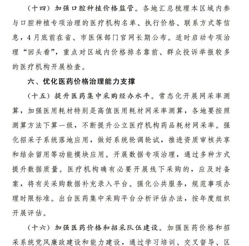 一方面要落實口腔種植綜合治理措施。落地實施種植體系統集采結果,引導醫療機構優先采購使用中選產品。四川醫保局率先開展牙冠競價掛網,其他省份及時跟進聯動四川的牙冠掛網價。各省于2月底前出臺口腔種植醫療服務價格治理政策文件,于4月中旬前全面落實全流程調控目標。