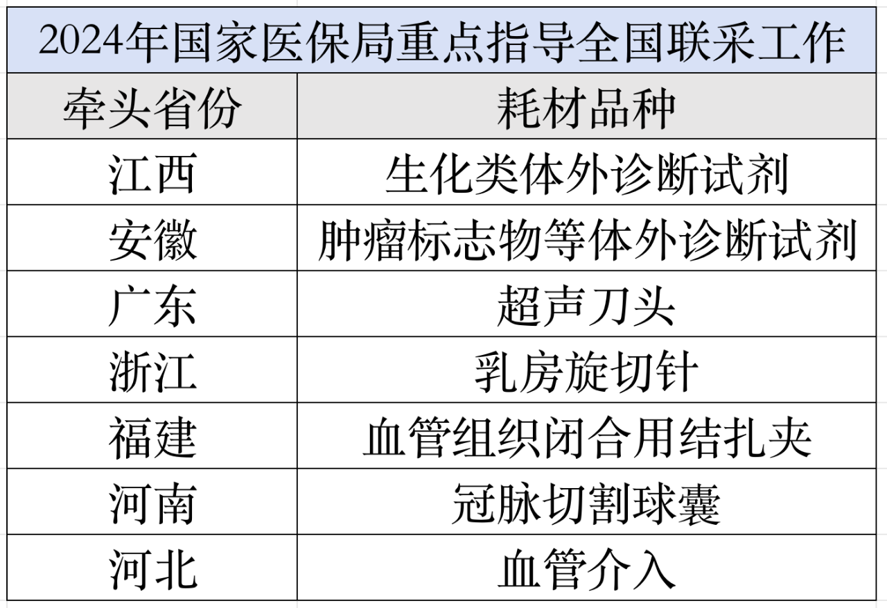 國家醫保局重點指導如下全國聯采工作:江西牽頭開展生化類體外診斷試劑聯盟采購;安徽牽頭開展腫瘤標志物等體外診斷試劑聯盟采購;廣東牽頭開展超聲刀頭聯盟采購;浙江牽頭開展乳房旋切針聯盟采購;福建牽頭開展血管組織閉合用結扎夾聯盟采購;河南牽頭開展冠脈切割球囊等聯盟采購;河北牽頭開展血管介入等耗材聯盟采購。
