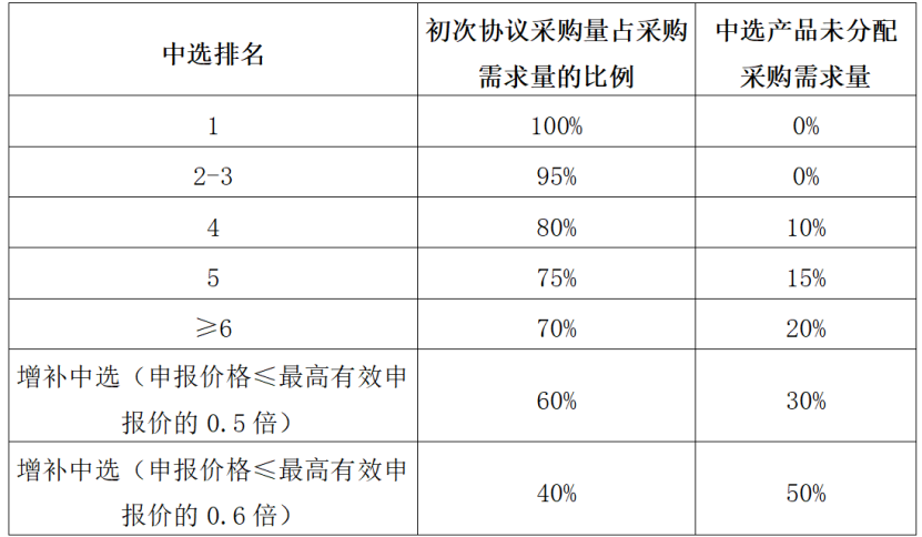 第一步:按中選排名確定初次協(xié)議采購(gòu)量,初次協(xié)議采購(gòu)量占采購(gòu)需求的比例見下表。根據(jù)醫(yī)療機(jī)構(gòu)的采購(gòu)需求量,四舍五入取整,計(jì)算各品種各企業(yè)的初次協(xié)議采購(gòu)量。