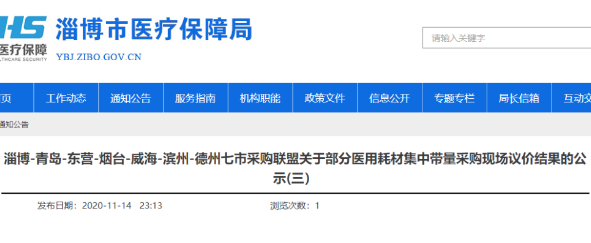 近日(11月14日),淄博市醫(yī)保局最新發(fā)布了一則《淄博-青島-東營-煙臺-威海-濱州-德州七市采購聯(lián)盟關(guān)于部分醫(yī)用耗材集中帶量采購現(xiàn)場議價結(jié)果的公示(三) 》(以下簡稱《公示》)。