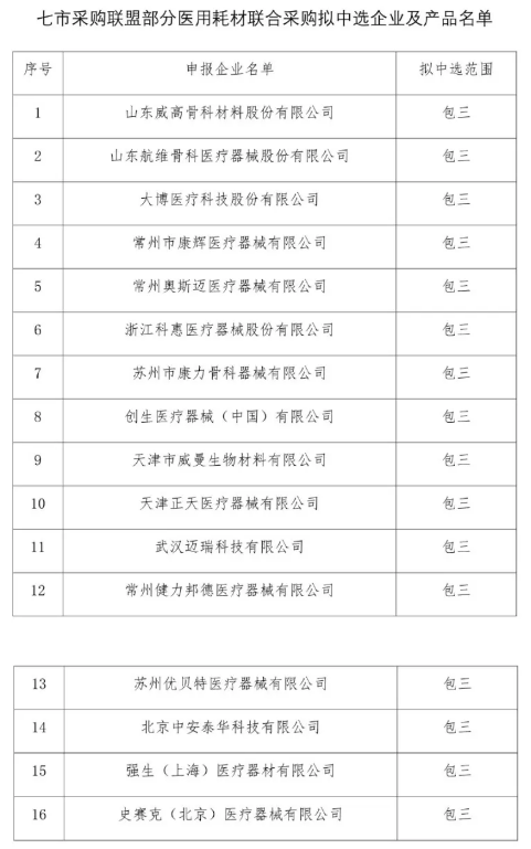 事實上,早在11月初,七市聯(lián)盟就已發(fā)布公告表示,將對骨科創(chuàng)傷類(普通接骨板及配套螺釘<國產(chǎn)/進(jìn)口>、鎖定接骨板及配套螺釘<國產(chǎn)/進(jìn)口>、髓內(nèi)釘系統(tǒng)及附件<國產(chǎn)/進(jìn)口>),血液透析類(血液過濾器、血液透析器、一次性使用透析護(hù)理包、血液透析濃縮液、一次性透析用血液回路管)兩類醫(yī)用耗材,以不低于年采購量70%的約定采購量以量換價。