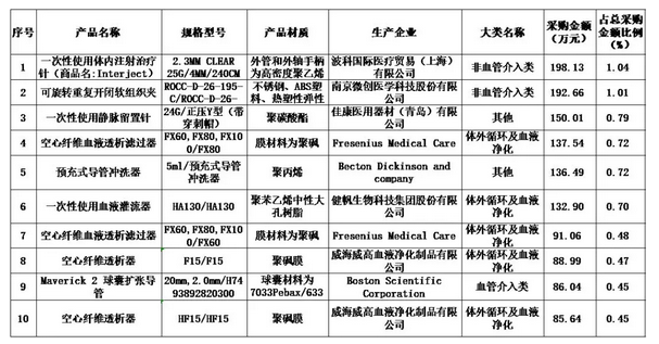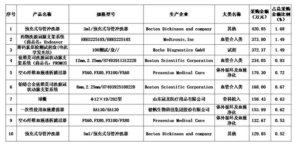 據(jù)了解,前10名醫(yī)用耗材合計采購金額為2323.32萬元,占醫(yī)用耗材總采購金額9.28%,其中BD的預(yù)充使導(dǎo)管沖洗器和美敦力的藥物洗脫冠脈支架系統(tǒng)位列采購前兩名。