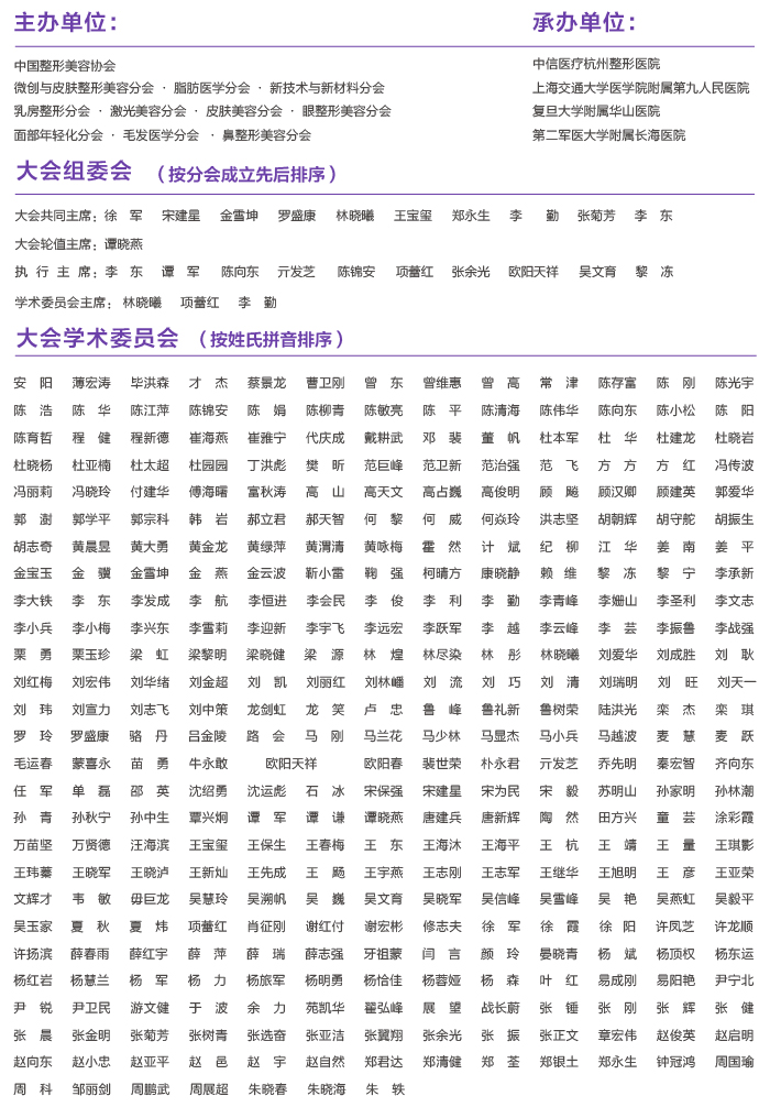 由中國整形美容協(xié)會微創(chuàng)與皮膚整形美容分會、 脂肪醫(yī)學(xué)分會、 新技術(shù)與新材料分會、 乳房整形分會、 激光美容分會、 皮膚美容分會、眼整形美容分會、面部年輕化分會、毛發(fā)醫(yī)學(xué)分會、鼻整形美容分會聯(lián)合主辦,中信醫(yī)療杭州整形醫(yī)院、上海交通大學(xué)醫(yī)學(xué)院附屬第九人民醫(yī)院、復(fù)旦大學(xué)附屬華山醫(yī)院、第二軍醫(yī)大學(xué)附屬長海醫(yī)院共同承辦的中國整形美容協(xié)會第五屆中國微創(chuàng)美容醫(yī)學(xué)大會將于2016年9月2-4日在上??鐕少彆怪行恼匍_。