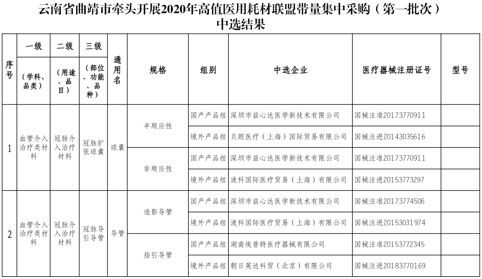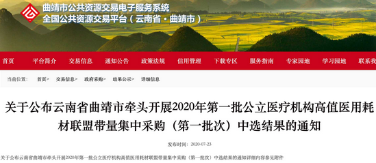 醫(yī)藥網(wǎng)7月27日訊 7月23日,云南省曲靖市牽頭開展2020年第一批公立醫(yī)療機(jī)構(gòu)高值醫(yī)用耗材聯(lián)盟帶量集中采購(第一批次)中選結(jié)果公布。