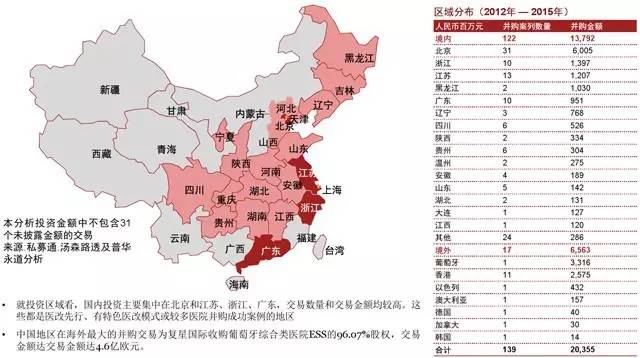 從地域來看,2012年至2015年,境內醫院并購活動主要集中在北京、江蘇、浙江和廣東等醫改先行地區,四地并購數量占總數的一半以上,投資金額占總額約70%。