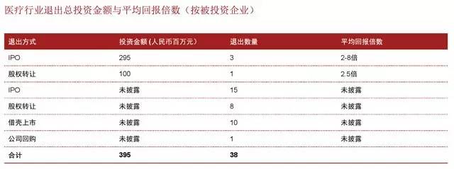報告顯示,醫療健康企業的投資退出方式主要為上市和股權轉讓,披露金額項目的平均投資回報率在2至8倍之間,上市板塊主要集中在香港主板和新三板。