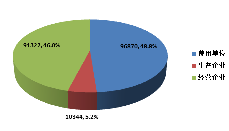 截止2015年12月31日,在全國醫療器械不良事件監測系統中,注冊基層用戶(包括醫療器械生產企業、經營企業和使用單位)共198, 536家。其中,醫療器械生產企業10,344家,占注冊基層用戶總數的5.2%;經營企業91,322家,占注冊基層用戶的46.0%;使用單位96,870家,占注冊基層用戶的48.8%(圖1-4)。
