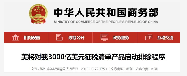 10月22日,國家商務(wù)部發(fā)布消息稱,美將對我3000億美元征稅清單產(chǎn)品啟動排除程序。