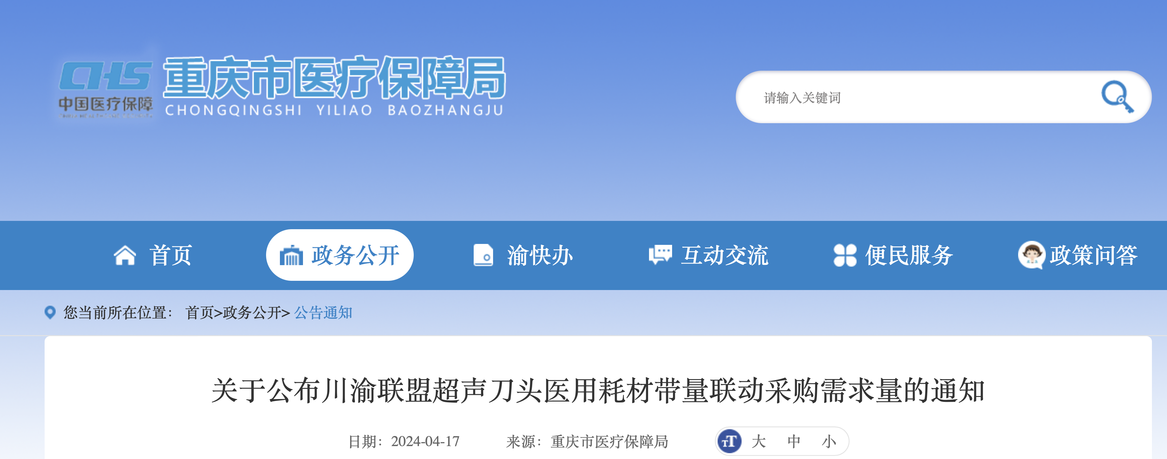 4月17日,重慶市醫保局連發三份文件,分別為《關于開展川渝聯盟超聲刀頭醫用耗材帶量聯動采購報價及解密工作的通知》《關于公布川渝聯盟超聲刀頭醫用耗材帶量聯動采購產品信息的通知》《關于公布川渝聯盟超聲刀頭醫用耗材帶量聯動采購需求量的通知》。