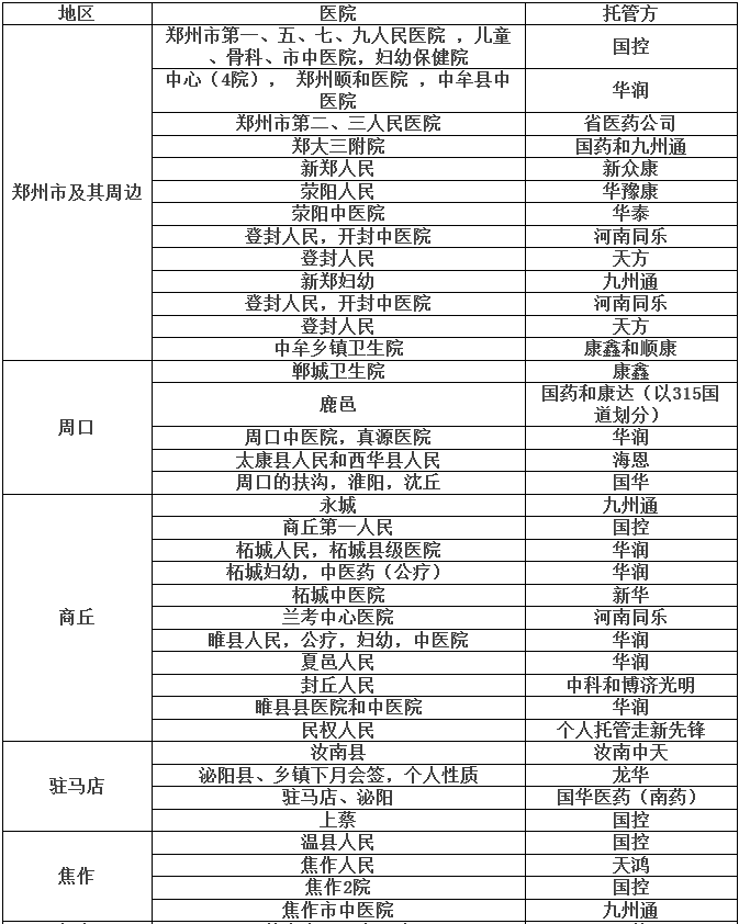 事實上,九州通、華潤醫藥、國藥等藥事巨頭近年來高歌猛進的藥房托管已經為今天的耗材集采和托管服務埋下了深厚的伏筆——本質是大規模并購后的醫藥物流服務延伸入院的頂層利益格局的滲透。下面是河南省在2015年的藥事(含部分耗材)供應托管統計表,有興趣的同仁可以深度了解一下: