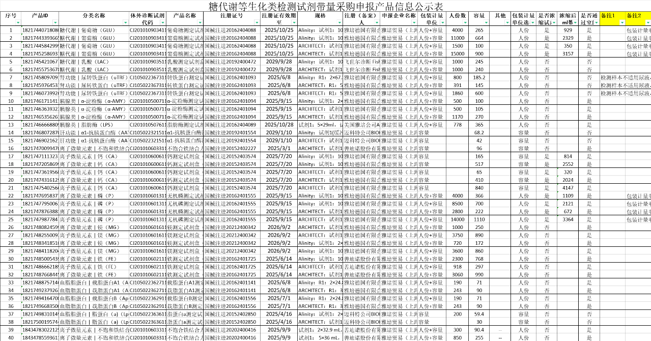 江西生化試劑集采系第二個正式啟動的全國聯(lián)采項目,采購品種包括糖代謝、離子微量元素、血脂和脂蛋白、肝功類、胰腺類、腎功類6個類別35個品種,具體如下: