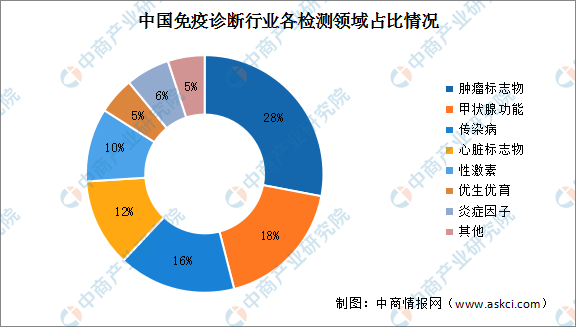 根據(jù)中商產(chǎn)業(yè)研究院統(tǒng)計,從免疫診斷行業(yè)各個細(xì)分市場來看,腫瘤標(biāo)志物檢測、甲狀腺功能檢測和傳染病檢測是我國免疫診斷項目中,規(guī)模排名前三的領(lǐng)域。其中腫瘤標(biāo)志物檢測項目市場最大,占比達(dá)到28%。