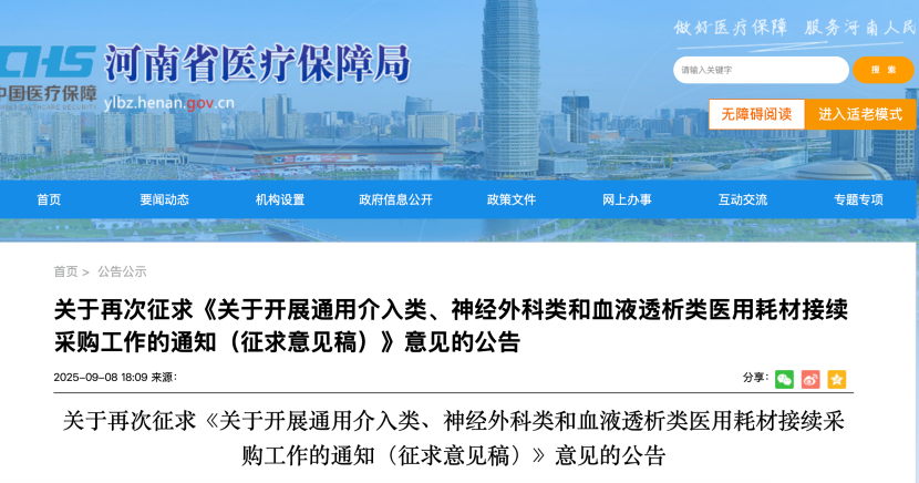 9月8日,河南醫保局發布《關于再次征求<關于開展通用介入類、神經外科類和血液透析類醫用耗材接續采購工作的通知(征求意見稿)>意見的公告》。
