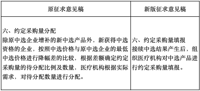 約定采購量分配規則方面也有調整,按降幅差分量的內容被刪掉,替換為醫療機構對中選產品進行約定采購量填報。