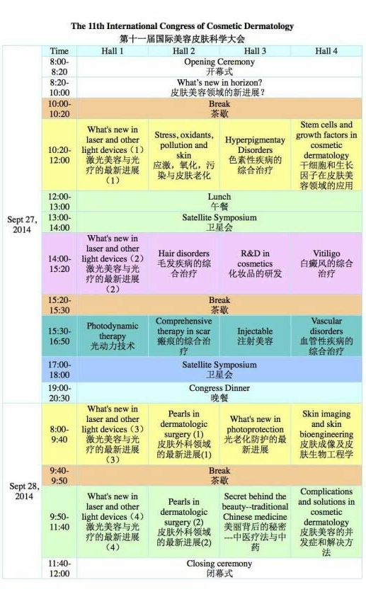 第十一屆國際美容皮膚科學大會將于2014年9月26-28日在中國北京國際會議中心召開。本次會議由國際美容皮膚科學會(International Society of Cosmetic Dermatology)主辦,中華醫學會和中華醫學會皮膚性病學分會承辦,北京大學人民醫院和中國醫科大學附屬第一醫院協辦。陳洪鐸院士、意大利Pierfrancesco Morganti教授、劉雁飛教授任大會名譽主席,張建中教授、高興華教授任大會共同主席,劉瑋教授任大會秘書長。