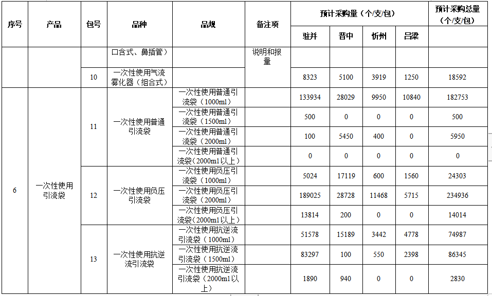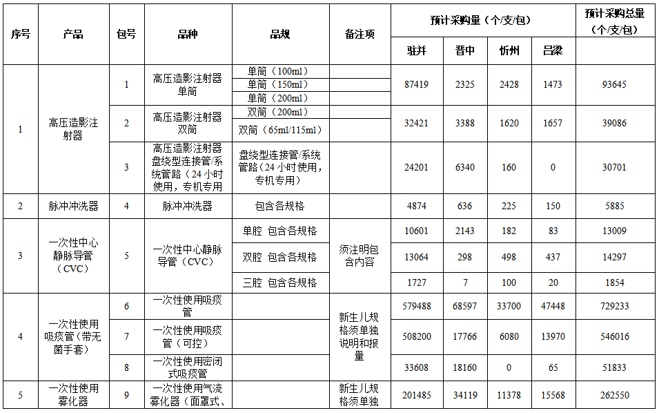 本次集中談判議價(jià)采購的耗材有六類,分為13個(gè)采購包,包括:高壓造影注射器、脈沖沖洗器、一次性中心靜脈導(dǎo)管(CVC)、一次性使用吸痰管(帶無菌手套)、一次性使用霧化器、一次性使用引流袋。