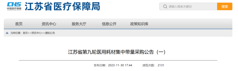 12月2日,江蘇醫(yī)保局發(fā)布《江蘇省第九輪醫(yī)用耗材集中帶量采購公告(一)》(以下簡稱《公告》),決定開展省第九輪醫(yī)用耗材集中帶量采購。