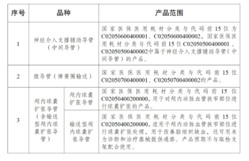 本輪集中帶量采購品種包括神經(jīng)介入支撐輔助導(dǎo)管(中間管)、微導(dǎo)管(彈簧圈輸送)、顱內(nèi)球囊擴張導(dǎo)管(含型顱內(nèi)球囊擴張導(dǎo))。