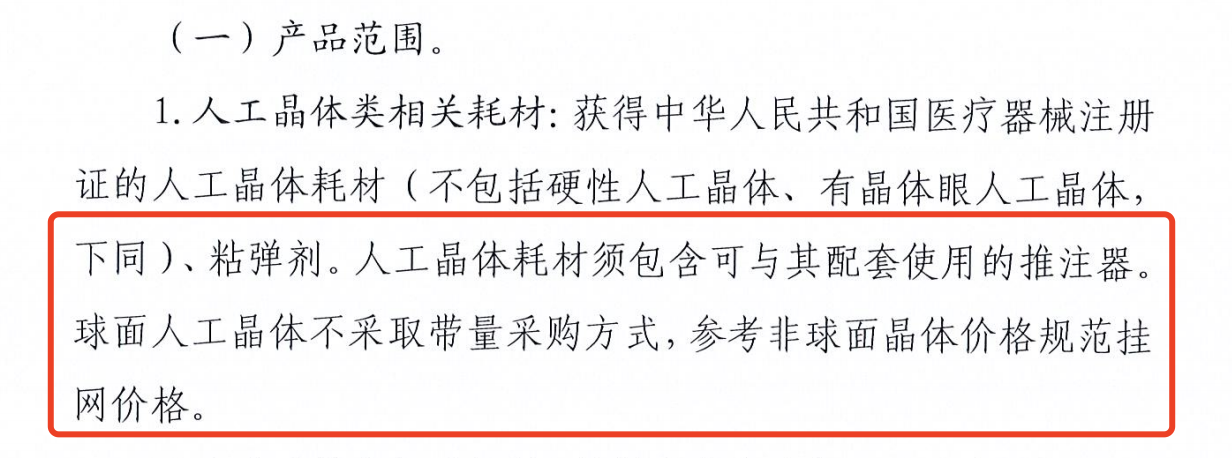 其中,球面人工晶體不采取帶量采購方式,參考非球面晶體價格規范掛網價格。