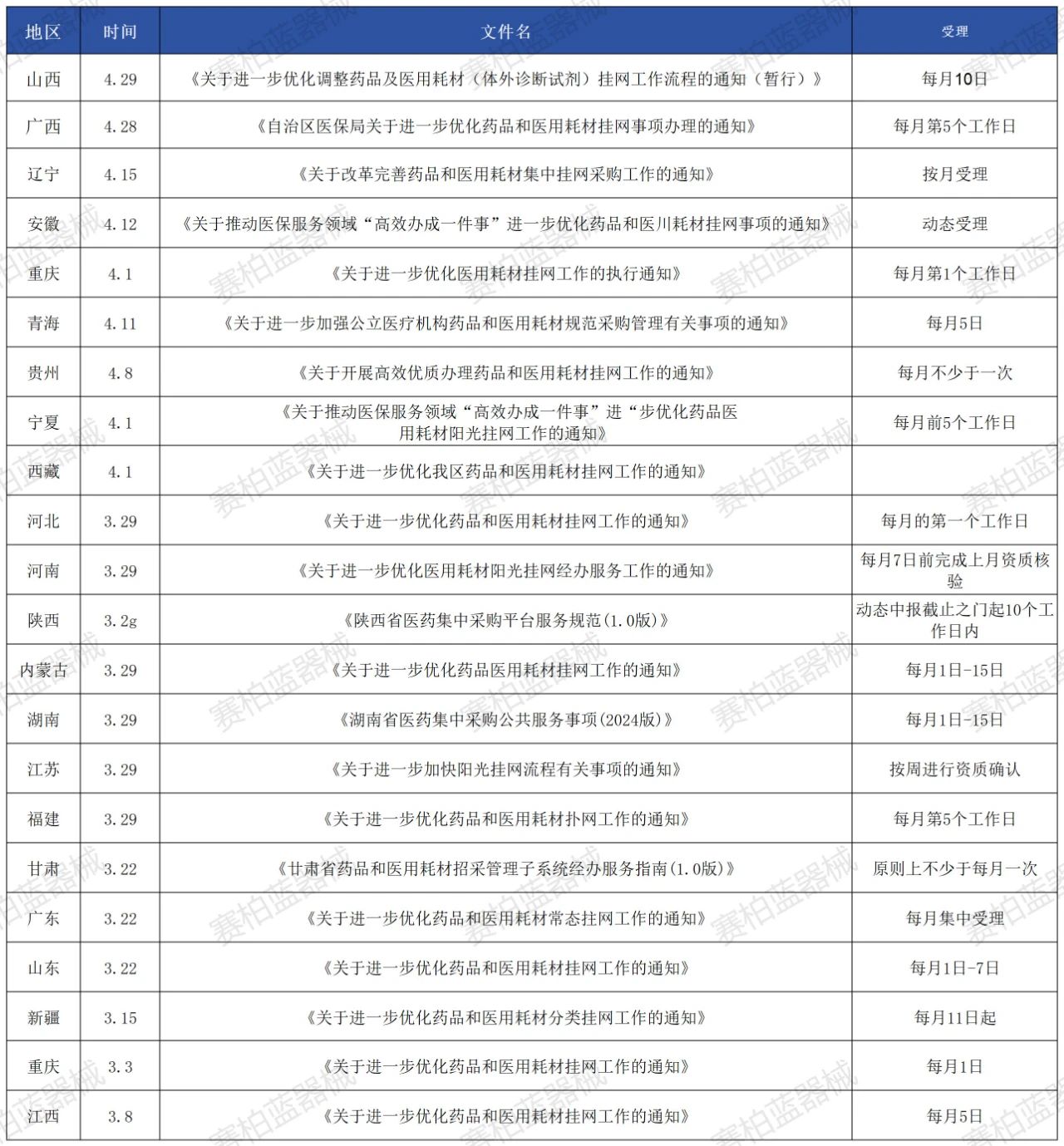 據(jù)賽柏藍器械不完全統(tǒng)計,截止目前已有超過20省發(fā)布有關(guān)優(yōu)化耗材掛網(wǎng)流程的相關(guān)通知,具體如下: