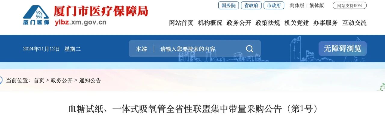 11月11日,福建省廈門市醫保局發布《血糖試紙、一體式吸氧管全省性聯盟集中帶量采購公告(第1號)》和《血糖試紙、一體式吸氧管全省性聯盟集中帶量采購公告(第2號)》。