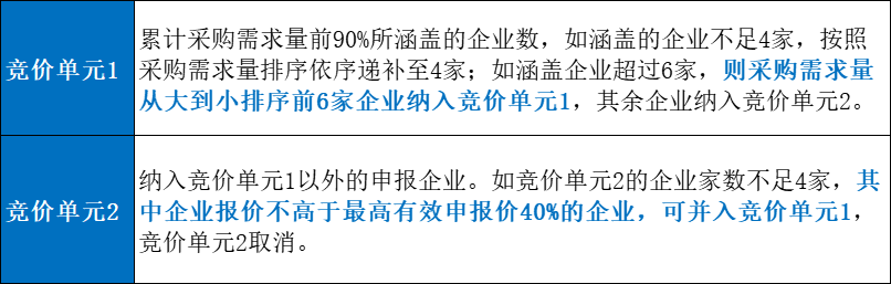 在競價單元中,淘汰本競價單元企業排名后50%的企業,其余企業獲得擬中選資格。若競價單元2取消,未并入競價單元1的企業直接淘汰。