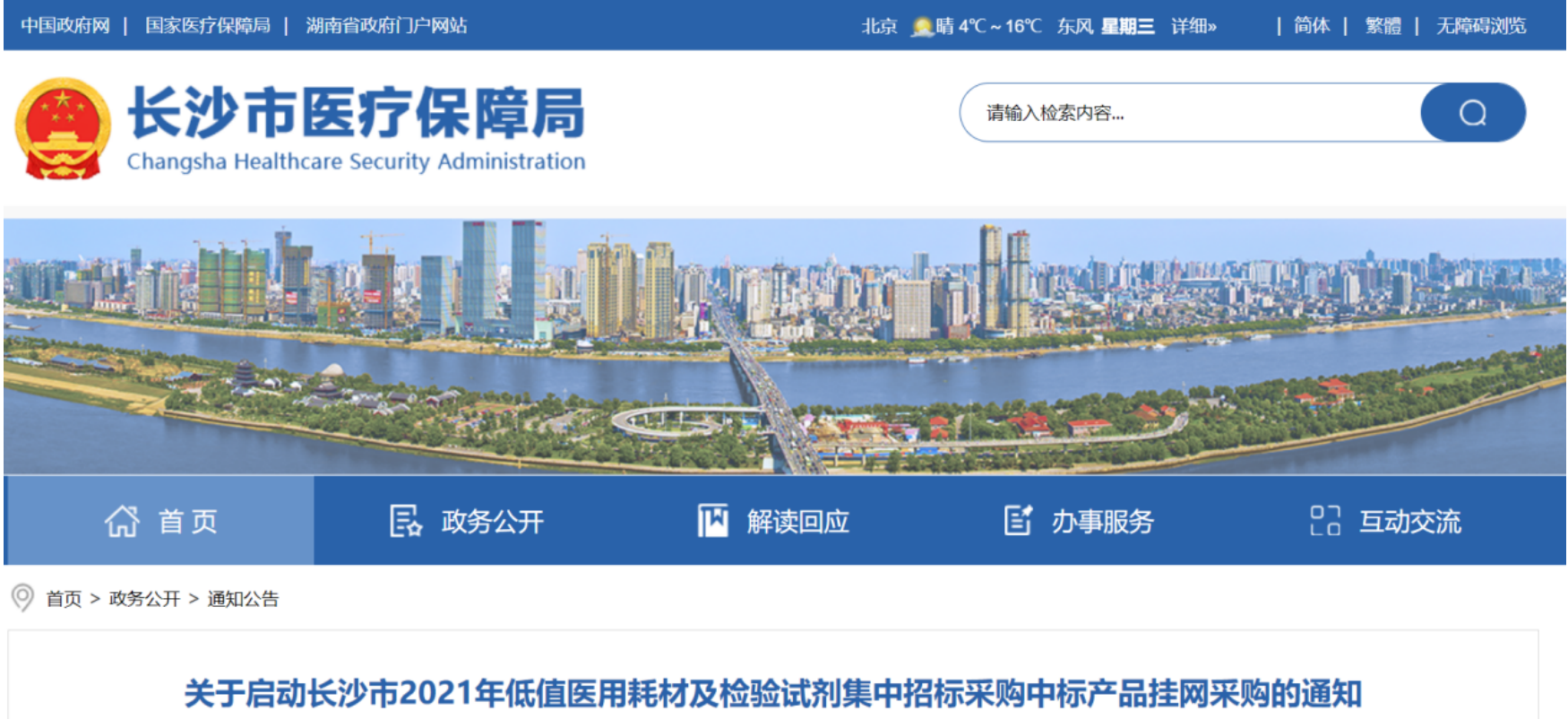 據(jù)長沙市醫(yī)保局消息,自11月1日起,該市2021 年低值醫(yī)用耗材及檢驗試劑集中招標(biāo)采購中標(biāo)結(jié)果正式掛網(wǎng)執(zhí)行。
