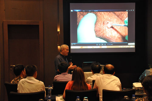(圖為ellman國際大中華區(qū)營銷總監(jiān)凌蔚翔先生講解ellman皮膚科射頻機知識)