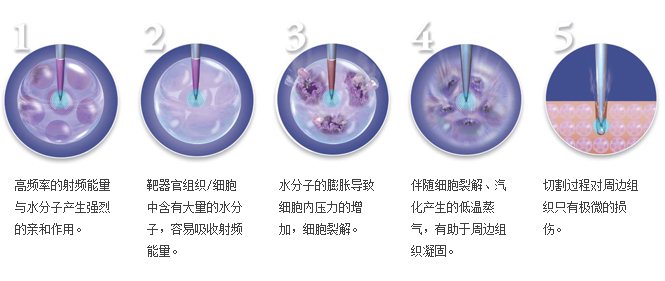 切割引起副損傷的一個重要指標是切割口倆側的側面組織損傷。低能量的射頻產生脫水和凝止血作用。發射極向作用組織發射特定的無線電波,被作用組織細胞內的水分子相互振蕩摩擦產生內部熱,引起組織細胞內脫水,組織收縮而達到凝止血作用。與由外向內通過熱傳導的電刀凝止血原理相反,射頻凝止血產生的熱是由內向外傳導。在有效凝止血條件下,射頻凝止血所需的能量小,被作用的組織無或很輕微的碳化作用,且與電極無粘附現象。