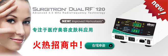 美國ellman公司全新設計的產品SURGITRON DUAL RF 120IEC機型,提供了最新的射頻止血功能,而且是目前全球擁有4.0Mhz和 1.7Mhz的雙射頻產品!目前,產品現正在火熱招商中,如果您有意向,可直接點擊在線申請!