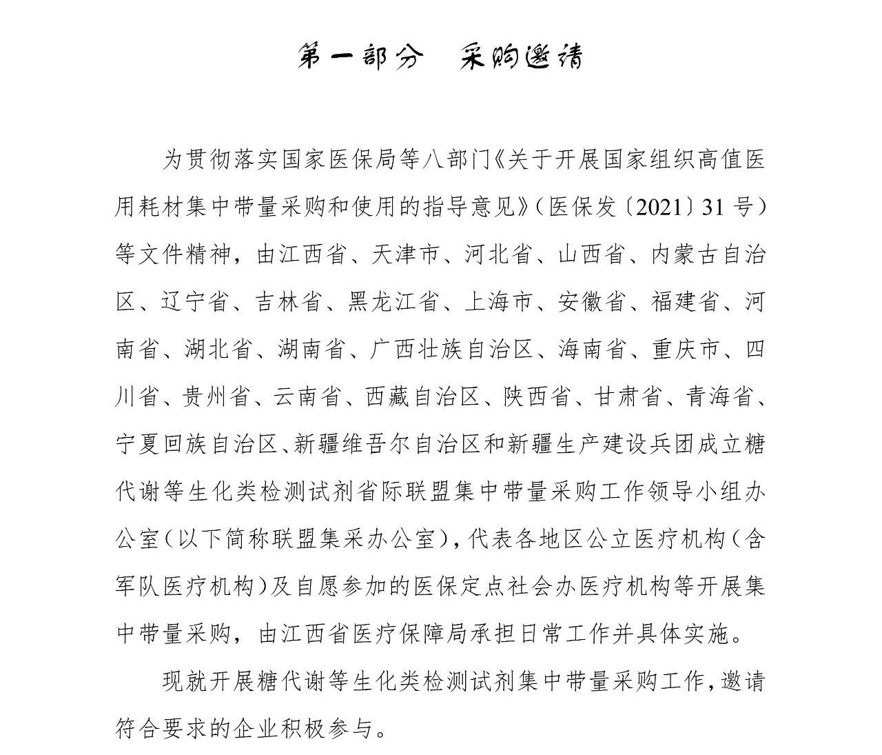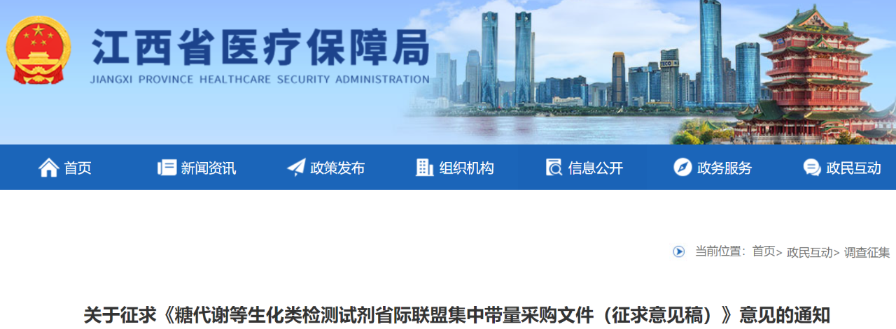 今日(9月9日),江西省醫療保障局《糖代謝等生化類檢測試劑省際聯盟集中帶量采購文件(征求意見稿)》(完整附文末)。