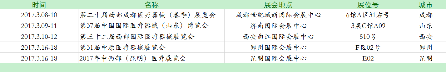 日前,為期半個月的五個展會相繼圓滿結束 !! 分別是“第二十屆西部成都醫療器械(春季)展覽會”、“第37屆中國國際醫療器械(山東)博覽會”、“第三十二屆西部國際醫療器械展覽會”、“第31屆中原醫療器械展覽會”、以及“2017年中西部(昆明)醫療展覽會” 。詳細時間地點見下表