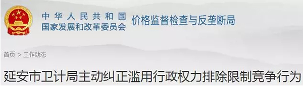 1月2日,國家發(fā)改委價監(jiān)局發(fā)布一則《延安市衛(wèi)計局主動糾正濫用行政權力排除限制競爭行為》的消息,這條信息來自陜西省物價局反壟斷分局。