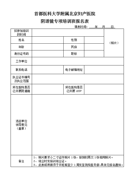 1、在北京婦產醫院官網科研教學欄目(http://www.bjogh.com.cn/kj/jj/)下載我院陰道鏡專項培訓班報名表,開班前至少1周,按要求填好后郵寄北京婦產醫院醫務部,郵寄地址:北京市朝陽區姚家園路251號北京婦產醫院(東院)培訓樓107室醫務部(郵編100026)。