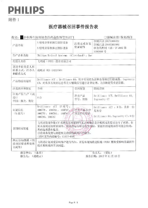 飛利浦(中國)投資有限公司報告,涉及產(chǎn)品某些緊固件無法被確認是否根據(jù)規(guī)范要求進行了扭轉(zhuǎn),如果未按規(guī)定扭轉(zhuǎn)緊固件,則系統(tǒng)運行時會發(fā)生故障,緊固件固定的部件可能會松動,從而造成潛在危害。飛利浦(中國)投資有限公司對X射線計算機斷層攝影設備(注冊證號:國械注進20153300422、國食藥監(jiān)械(進)字2012第3303860)、X射線計算機體層攝影設備(注冊證號:國械注進20163301984、)主動召回。召回級別為三級。涉及產(chǎn)品的型號、規(guī)格及批次等詳細信息見《醫(yī)療器械召回事件報告表》。