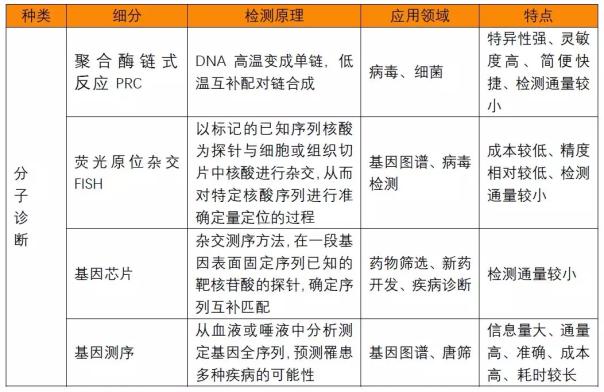 分子診斷主要是應(yīng)用分子生物學(xué)方法檢測(cè)生物體內(nèi)遺傳物質(zhì)的結(jié)構(gòu)或表達(dá)水平的變化而做出診斷的技術(shù)。由于分子診斷可以從基因?qū)哟芜M(jìn)行檢測(cè),因此檢測(cè)靈敏度和準(zhǔn)確性的優(yōu)勢(shì)較為明顯,可在感染初期識(shí)別病毒或者提早確認(rèn)基因缺陷,從而提供個(gè)性化的醫(yī)療診斷服務(wù),主要應(yīng)用于遺傳病、傳染性疾病、腫瘤等疾病的檢測(cè)與診斷。分子診斷主要包括核酸診斷和生物芯片技術(shù)。