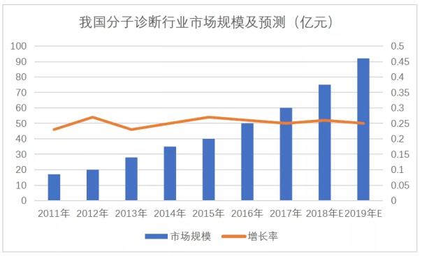 火石創(chuàng)造統(tǒng)計(jì)數(shù)據(jù):近年全球分子診斷行業(yè)年均增速約為11%,而我國(guó)分子診斷行業(yè)年均增速則達(dá)到了24%,為全球增速的兩倍。預(yù)計(jì)到2019年,我國(guó)分子診斷市場(chǎng)規(guī)模將有望超過(guò) 90 億元。