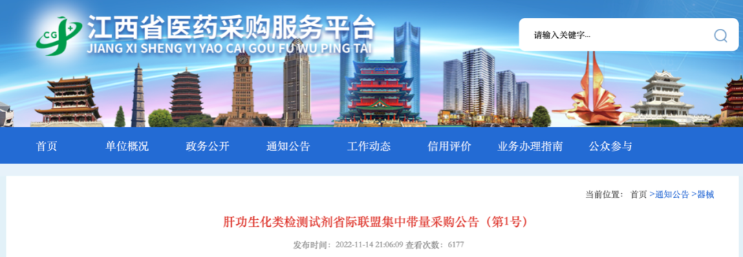 11月14日,江西省藥品醫用耗材集中采購聯席會議辦公室發布《肝功生化類檢測試劑省際聯盟集中帶量采購公告(第1號)》(以下簡稱《公告》)。23省肝功生化帶量采購正式文件發布,并公布《肝功生化類檢測試劑企業產品信息》(具體名單見文末)。
