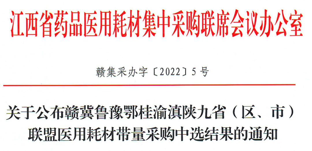 3月8日,江西省藥品醫(yī)用耗材集中采購聯(lián)席會議辦公室發(fā)布《關(guān)于公布贛冀魯豫鄂桂渝滇陜九省(區(qū)、市) 聯(lián)盟醫(yī)用耗材帶量采購中選結(jié)果的通知》(以下簡稱通知)。