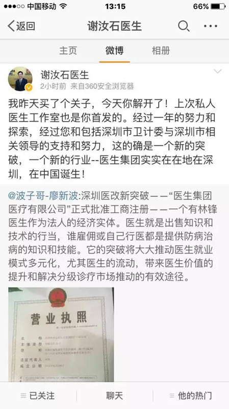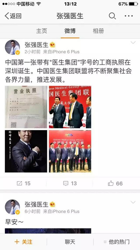 今天張強(qiáng)又發(fā)微博稱:“中國第一張帶有“醫(yī)生集團(tuán)”字號(hào)的工商執(zhí)照在深圳誕生。中國醫(yī)生集團(tuán)聯(lián)盟將不斷聚集社會(huì)各界力量,推進(jìn)發(fā)展。”