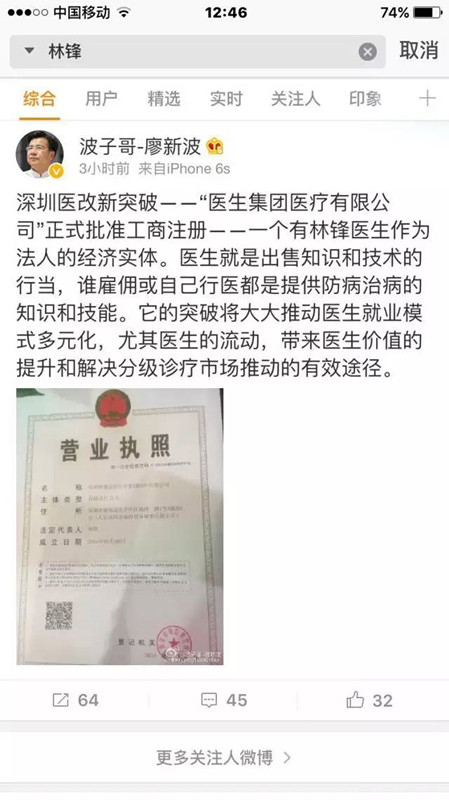 3月8日,中國第一張帶有“醫(yī)生集團(tuán)”字號(hào)的工商執(zhí)照在深圳誕生,“嶺南三劍客”之一林鋒任法人。