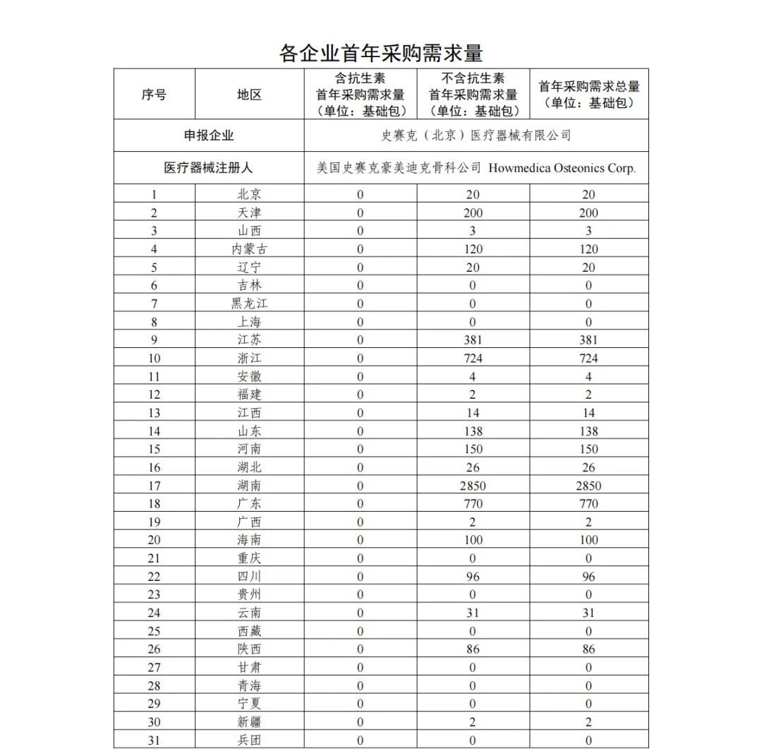 采購需求量方面,《采購文件》指出,首年采購需求量按參加本次集中帶量采購的每一家醫療機構報送的采購需求量累加得出,以 20g 粉末所對應的關節骨水泥產品為 1 個“基礎包”統計(不同包裝規格產品按粉劑重量等比例轉換為基礎包數量,如出現小數,則向下取整至個位)。