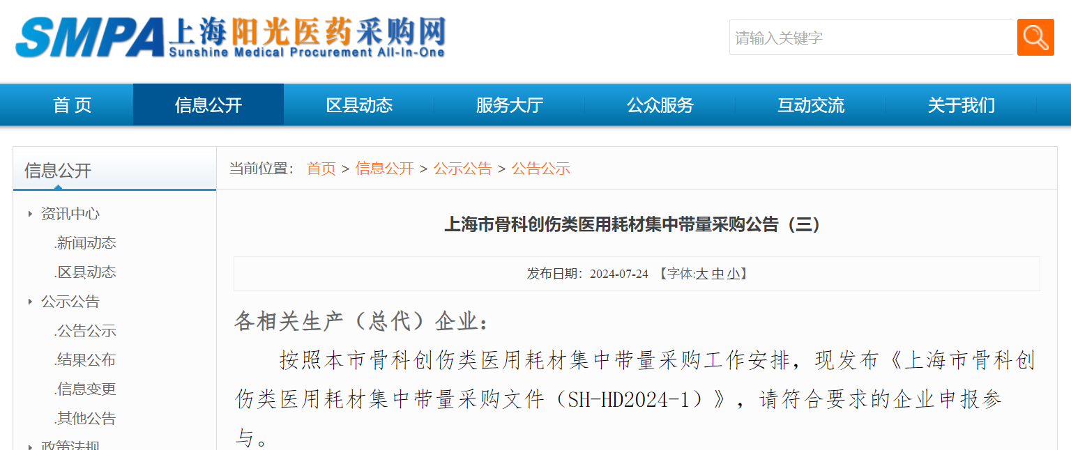 7月24日,上海陽(yáng)光醫(yī)藥采購(gòu)網(wǎng)發(fā)布《上海市骨科創(chuàng)傷類醫(yī)用耗材集中帶量采購(gòu)文件(SH-HD2024-1)》(完整見(jiàn)文末),新一輪骨科創(chuàng)傷類耗材集采啟動(dòng)。