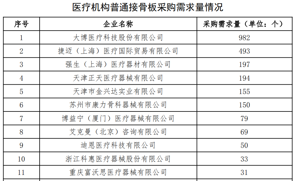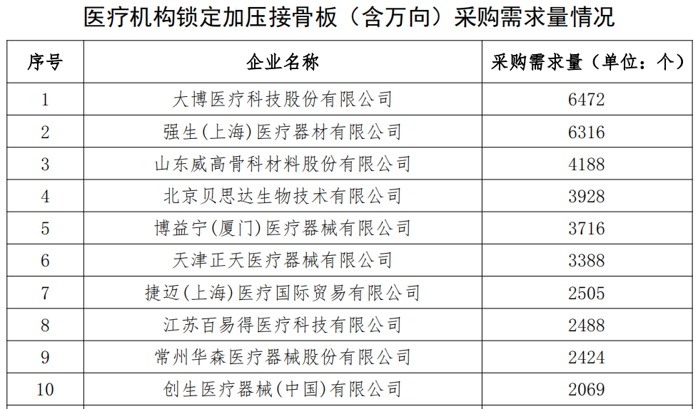 本次集采周期為兩年,首年采購(gòu)需求總量為78175個(gè),其中普通接骨板2605個(gè)、鎖定加壓接骨板(含萬(wàn)向)51805個(gè)、髓內(nèi)釘23765個(gè)。
