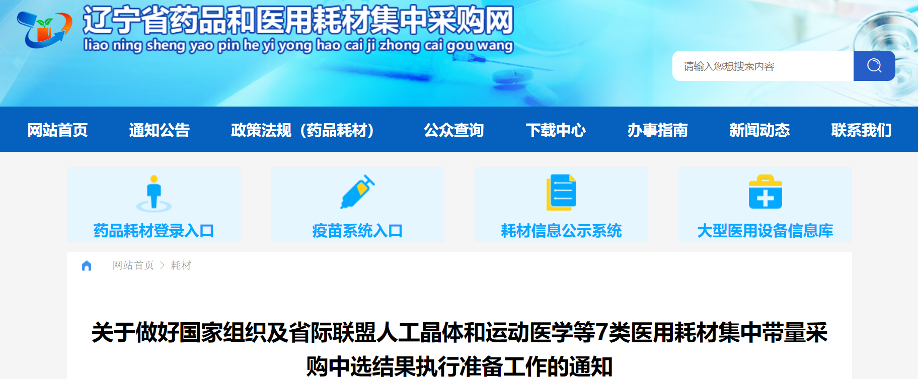 同日,遼寧省藥品及醫用耗材集中采購網發布《關于做好國家組織及省際聯盟人工晶體和運動醫學等7類醫用耗材集中帶量采購中選結果執行準備工作的通知》。