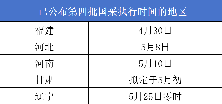 根據官方披露,第四批國采將于今年5-6月落地,目前已有多地公布了執行時間: